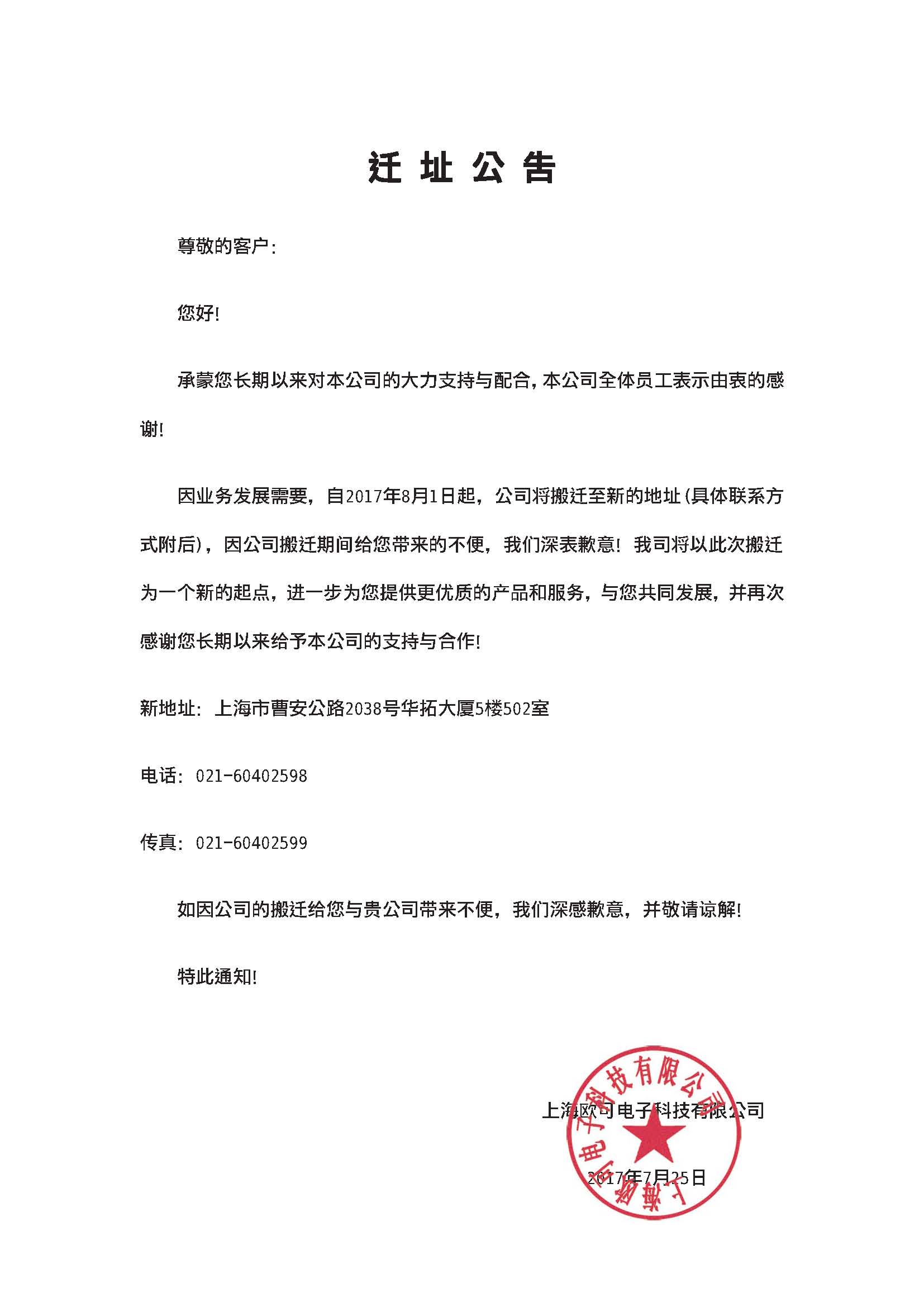 因業(yè)務(wù)發(fā)展需要,自2017年8月1日起,公司將搬遷至新的地址(具體聯(lián)系方式附后),因公司搬遷期間給您帶來(lái)的不便,我們深表歉意!...